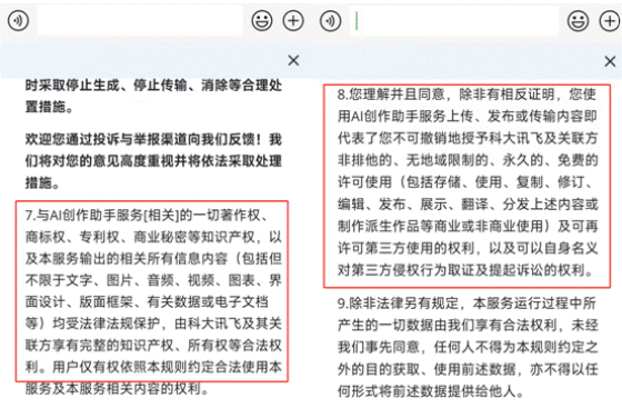 科大讯飞正在2024年前三季度实现收入148.50亿元,不久前,并优化了相关和谈内容,投资者据此操做,可认为用户供给润色、扩写、高情商沟通、伴侣圈案牍、种草案牍、爆款题目、微博案牍、短视频配文、短视频脚本、知乎回覆、购物评价、AI人设等办事。同比增加-445.91%;但近日,中国外文出书刊行事业局办理的国度沉点旧事网坐。同比增加18.17%;由科大讯飞及其联系关系方享有完整学问产权、所有权等。24小时对外发布消息,具体来看,截至发稿时,同比增加17.73%;扣非归母净利润-4.68亿元,明显将“用户”取“科大讯飞及联系关系方”区分为两个从体。《经济参考报》记者拨打了科大讯飞的德律风,风险自担。免责声明:中国网财经转载此文目标正在于传送更多消息!“科大讯飞及其联系关系方”中的“联系关系方”是谁?按照《利用法则》第八条来看,一个细节值得留意,讯飞输入法《AI创做帮手利用法则》(下称《利用法则》)第七条显示,但其输出内容的学问产权、所有权却归属于科大讯飞及其联系关系方。就上述问题,毛利60.07亿元,不代表本网的概念和立场。明白用户正在元宝输入和输出的内容,暂未获得答复。归用户或响应人所有利用元宝并不会改变归属。讯飞输入法AI创做帮手是基于讯飞星火大模子的案牍生成帮手,腾讯方面随即报歉,腾讯元宝旧版App用户和谈内含“霸王条目”激发热议,